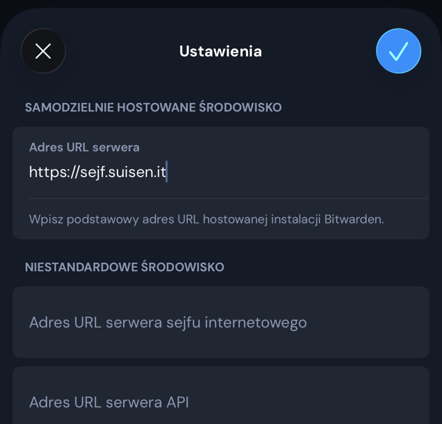 - Zainstaluj rozszerzenie Bitwarden w swojej przeglądarce i aplikację na telefonie, ustaw adres mojego serwera i zaloguj się.